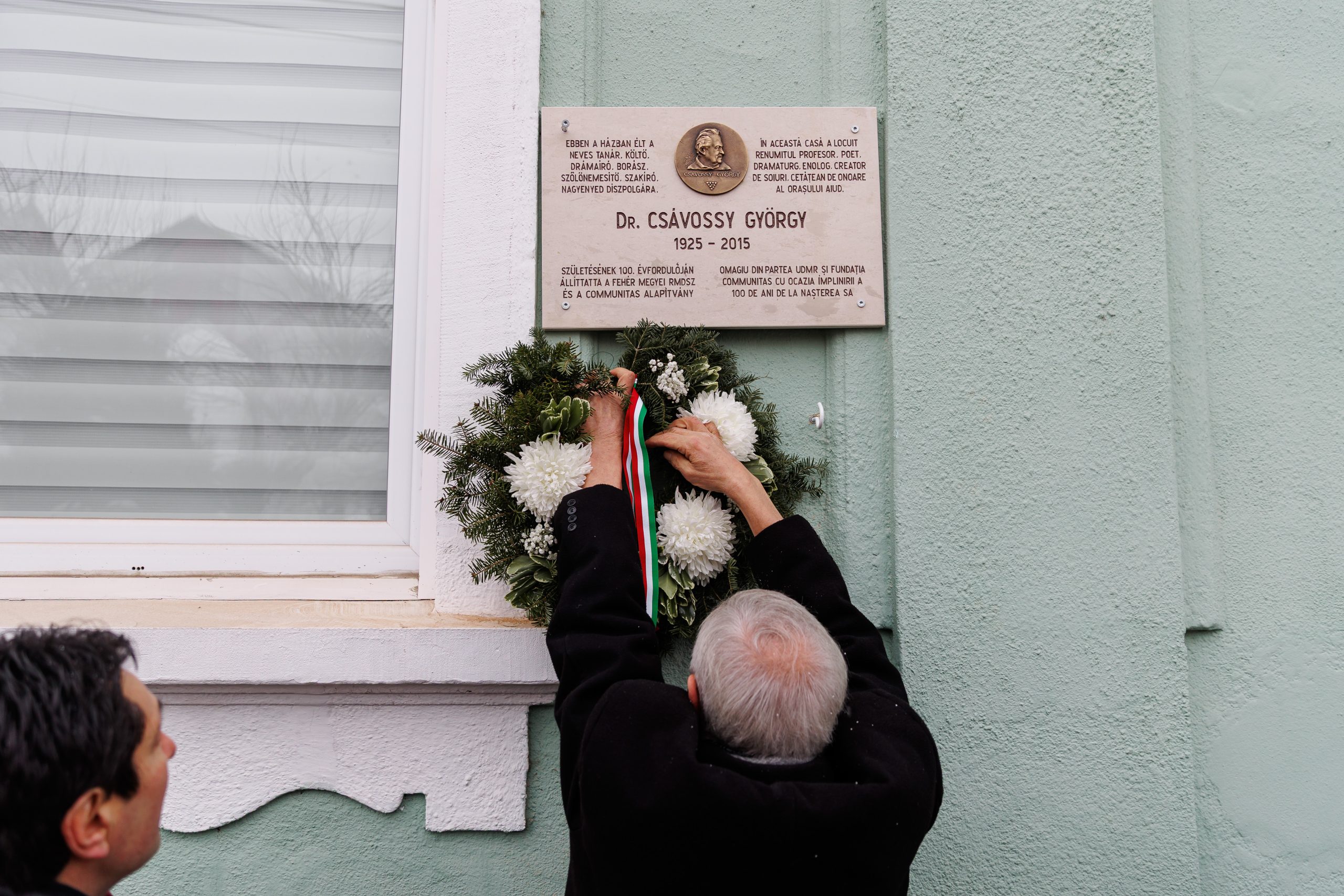 Elsőként Takács Csaba, a Communitas Alapítvány elnöke, szólt az egybegyűltekhez, Csávossy Györgyre emlékezve, egyszersmind az emlékjelhagyások fontosságát hangsúlyozva Nagyenyed közterein, középületein.